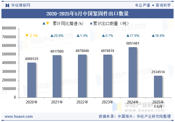 華經(jīng)產(chǎn)業(yè)研究院數據顯示:2025年1-5月中國緊固件出口數量為2534514噸,相比上年同期增長(cháng)了354805噸,同比增長(cháng)16.6%;出口金額為488485萬(wàn)美元,相比上年同期增長(cháng)了40383.6萬(wàn)美元,同比增長(cháng)9.3%。2025年5月中國緊固件出口數量為567246噸;出口金額為108448.6萬(wàn)美元。